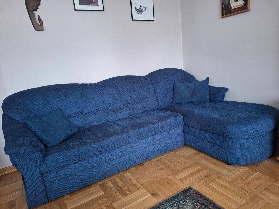 Oddam za darmo używaną kanapę z funkcją spania i pojemnikiem na pościel o wymiarach 250x160 cm w kolorze granatowym. Odbiór osobisty.Krzysztof